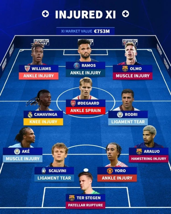 《德国转会阛阓》官推更新刻下五大联赛伤病气势,罗德里、厄德高、奥尔莫等金球奖候选球员在列,11位伤员总身价高达7.53亿欧元。门将:特尔施特根(巴萨);后卫:阿克(曼城)、斯卡尔维尼(亚特兰大)、约罗(曼联)、阿劳霍(巴萨);中场:卡马文加(皇马)、厄德高(阿森纳)、罗德里(曼城);前卫:尼科-威廉斯(毕尔巴鄂竞技)、贡萨洛-拉莫斯(巴黎)、奥尔莫(巴萨)。罗德里报销,曼城探讨冬窗引援