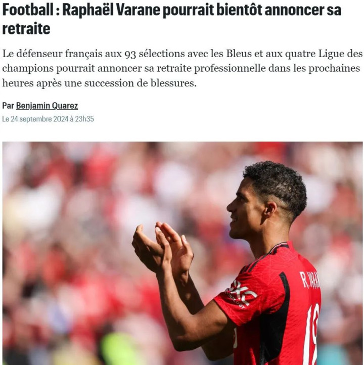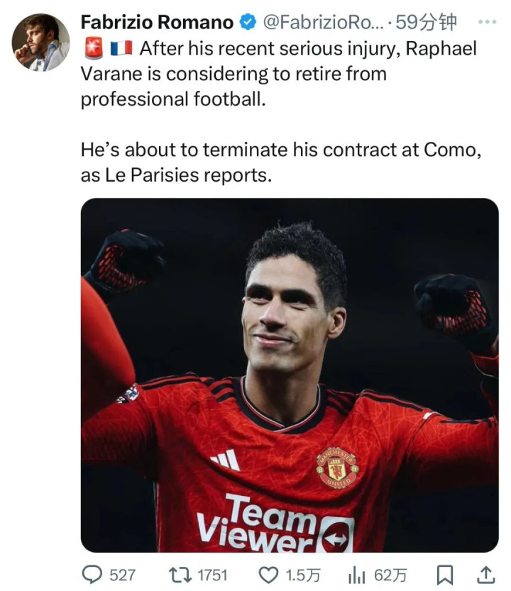 《巴黎东谈主报》报谈,在饱受伤病折磨后,31岁的前天下杯冠军后卫、法国名将瓦拉内正严肃探讨限制做事糊口,展望将在将来几天文牍这一音尘。