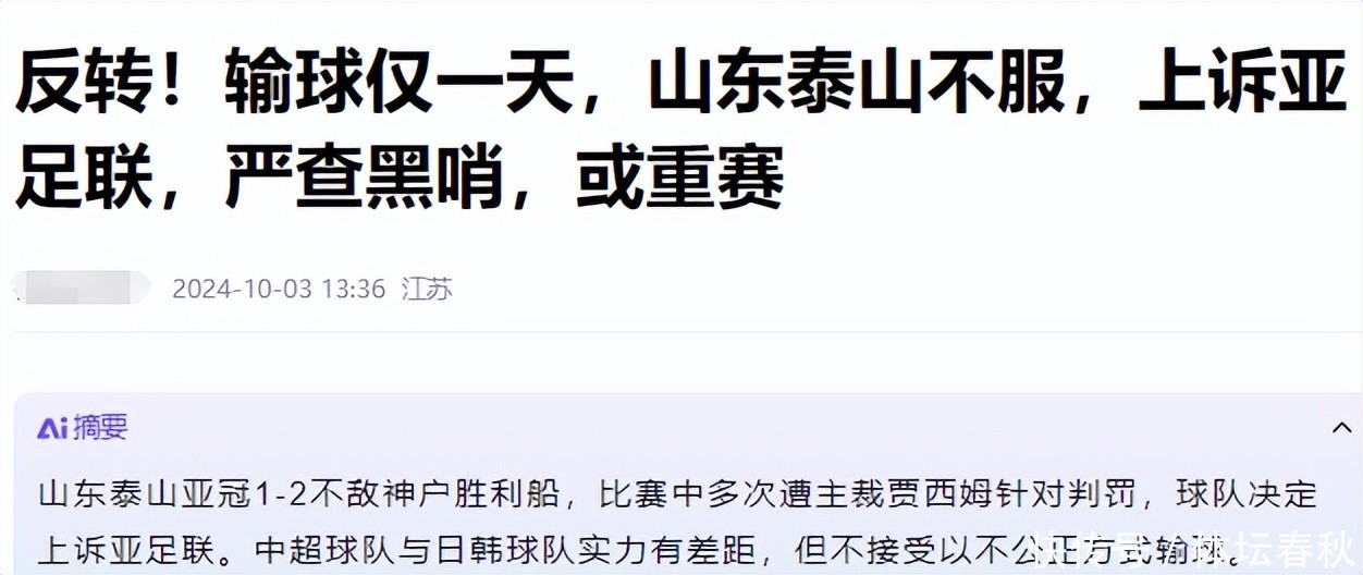 泰山队在亚冠赛场上遭受裁判的不公,反应出了中国足球在国外赛场上所面对的窘境。不行否定,中超球队与日韩强队之间存在果真力上的差距,但以这种神态输掉比赛,让许多山东泰山和其他的中国球迷齐感到委屈和震怒。