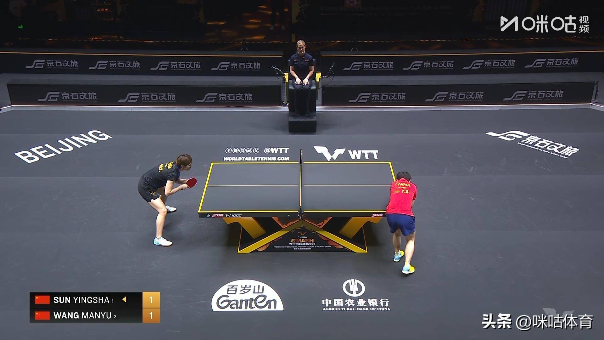 第三局追究插足比赛的高潮阶段,两边的攻防毫无保留,比分也来到9比9平,此时王曼昱运用一记正手变线当先拿到局点,随后运用孙颖莎接发冒高,王曼昱以一记反手拧拉奏凯得分,拿下舛错的第三局。