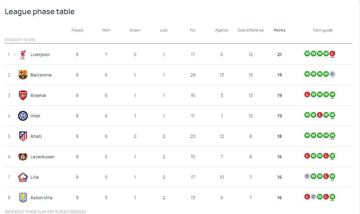 从积分榜,咱们不错看出,利物浦,巴萨,阿森纳,国外米兰,马德里竞技,勒沃库森,里尔以及阿斯顿维拉这8支球队获取平直晋级的经验,前八的球队亦然字据名次决定对阵,名按次1和第2的利物浦,巴萨将与里尔阿斯顿维拉进行分区,而名按次3和第4的阿森纳,国外米兰将同名按次5的马竞和名按次6的勒沃库森进行抽签分区。